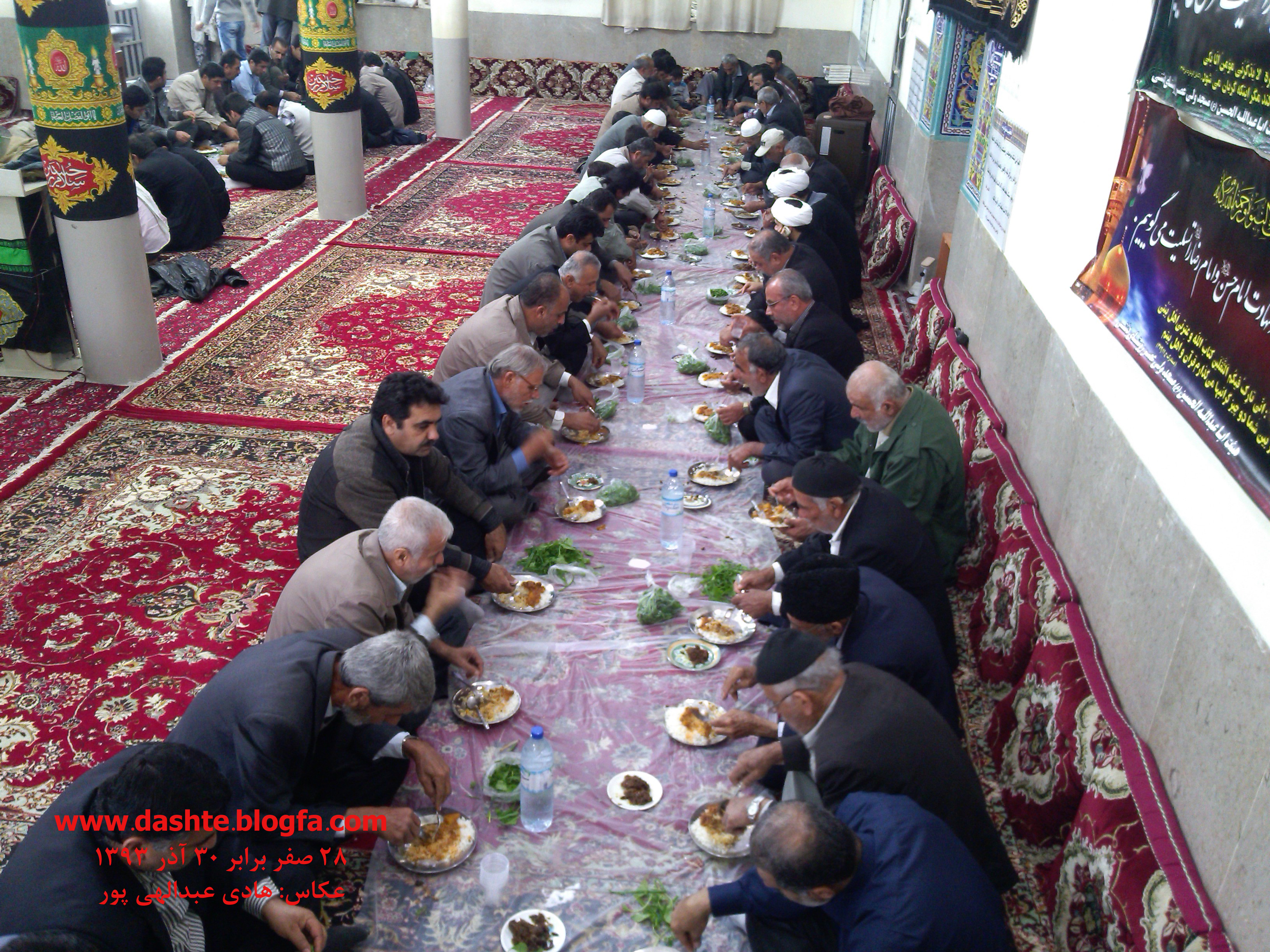 غلامحسین عیالبار: صرف طعام 28 ماه صفر عزاداران نبوی و رضوی روستای دشتی از توابع بخش آب پخش بعد از اقامه نماز ظهر و عصر در مؤرخ 30/9/1393 شمسی به روایت تصویر: